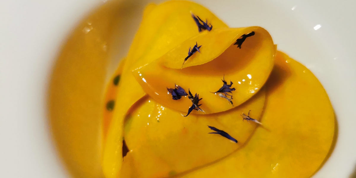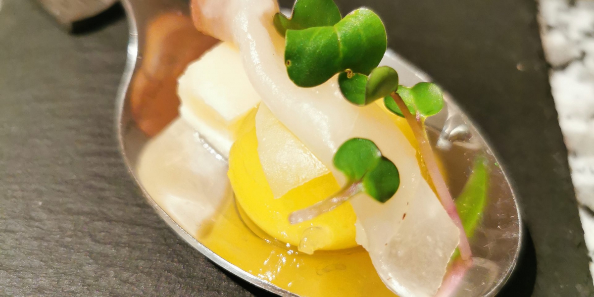 Orangen-Ingwer-Sphäre mit Gorgonzola und geflämmtem Lardo