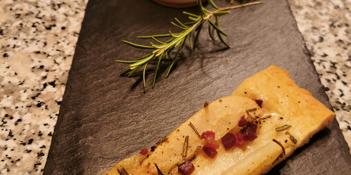 Rosmarin-Schaumsüppchen mit Waldhonig | Birnen-Rosmarin-Focaccia mit geräucherter Flugentenbrust