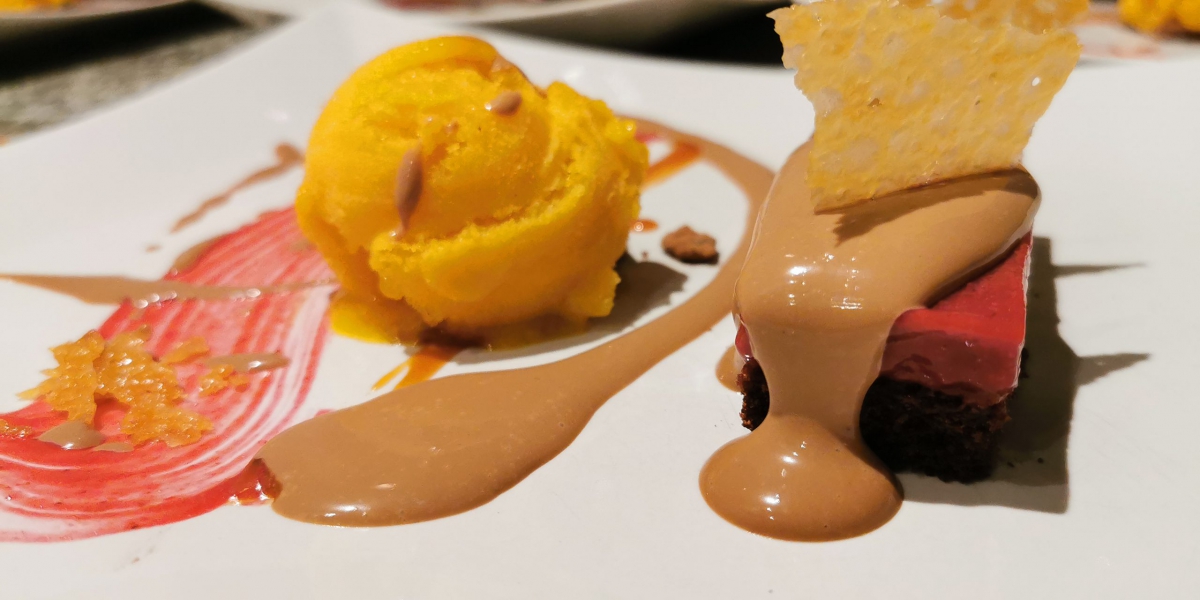 Törtchen von Schokoladenbisquit und Johannisbeere-Gelee | Earl-Grey-Tee-Nage | Orangen-Hookaido-Eis | Kürbiskernen